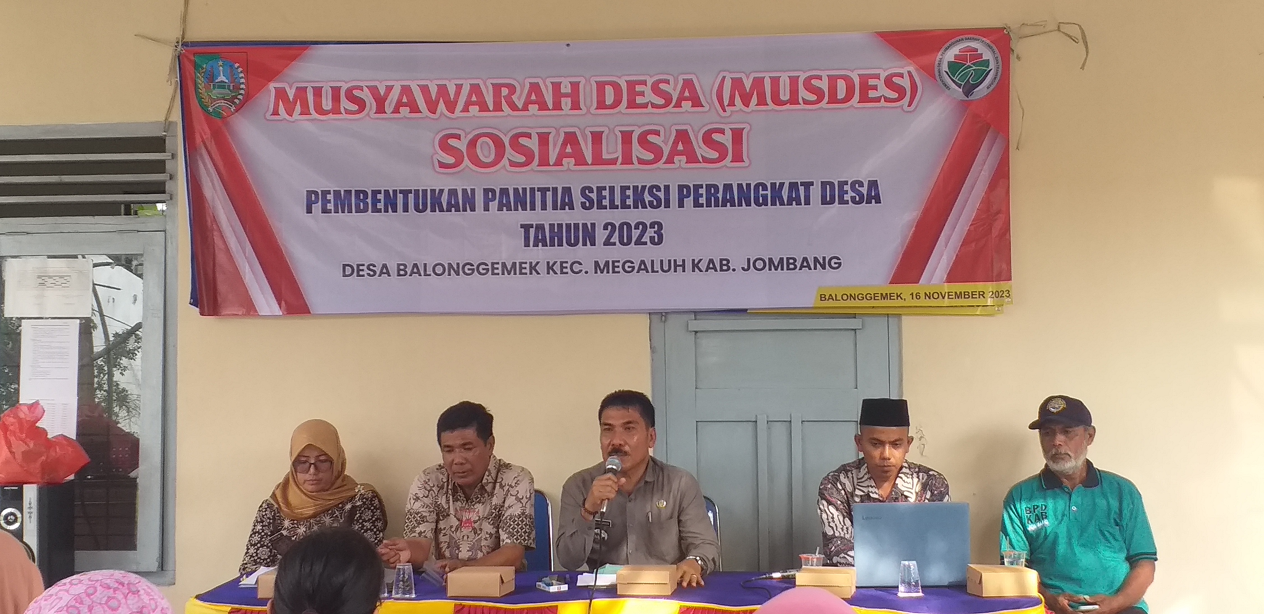 Megaluh - Camat Megaluh Shollahuddin, S.H, M.Si menghadiri undangan Musyawarah Desa (Musdes) Sosialisasi Pembentukan Panitia Seleksi Perangkat Desa Tahun 2023 (Kamis, 16/11/2023) bertempat di Balai Desa Balonggemek, Kecamatan Megaluh, Kab. Jombang